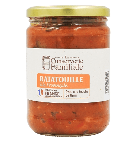 Ingrédients : courgettes 40%, pulpe de tomates 15,9%, aubergines frites 15% (aubergines, huile de tournesol), poivrons rouges 10%, oignons préfrits (oignons, huile de tournesol), purée de tomates, huile de tournesol, huile d’olive vierge extra, sel, amidon de maïs, sucre, épices et plantes aromatiques (ail, poivre et thym), acidifiant : acide citrique.