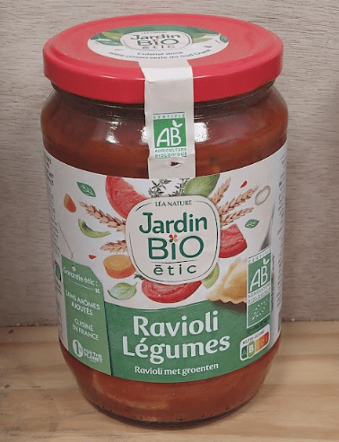 Ingrédients : purée de tomates* 37,5%, eau, ravioli* 15% [pâte* (semoule de blé* dur, eau), légumes* 1,5% (carottes*, poivrons*, oignons*, tomates*), couscous* (blé), chapelure* (farine de blé*, sel), huile de tournesol*, sel marin, plantes* aromatiques, purée d’ail*, poivre gris*], oignons* en morceaux, huile de tournesol*, sucre de canne*, bouillon de légumes* en poudre (sel marin, amidon de maïs*, extrait de levure*, huile de tournesol*, carottes*, poireaux*, épices*, plantes* aromatiques (céleri), céleri*), sel marin, basilic*, origan*.